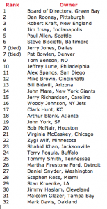 The Houston Chronicle and Yahoo Sports both published full ranked lists of NFL owners, 1 through 32. When you put those two lists side-by-side and split the differences, you get this list: